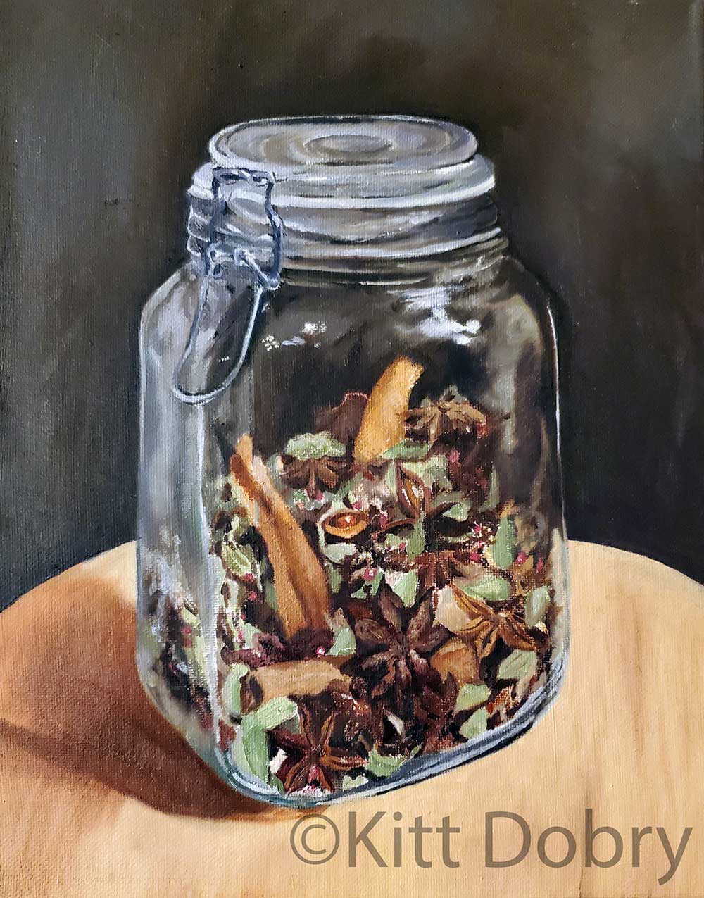 Still life of a mason jar 2/3rds full of the whole spices used in masala chai (anise, cloves, cardamom pods) sitting on a wood counter.