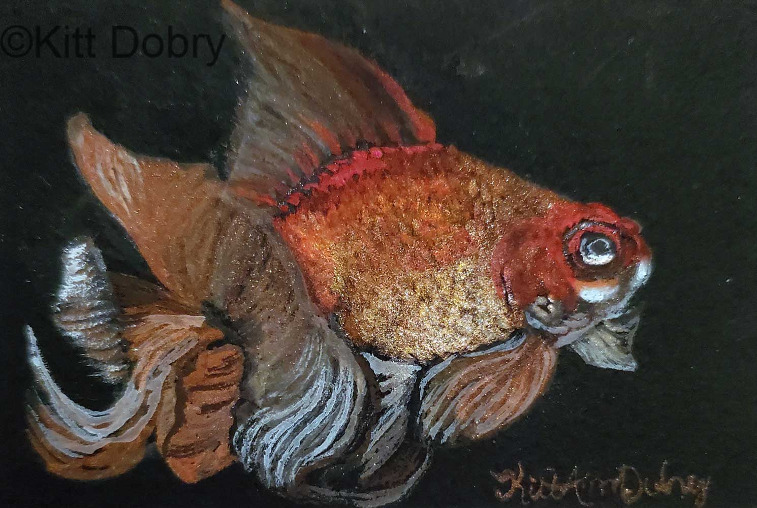 Watercolor painting of a fancy orange and gold goldfish on a stark black background, with subtle metallic touches to the scales.