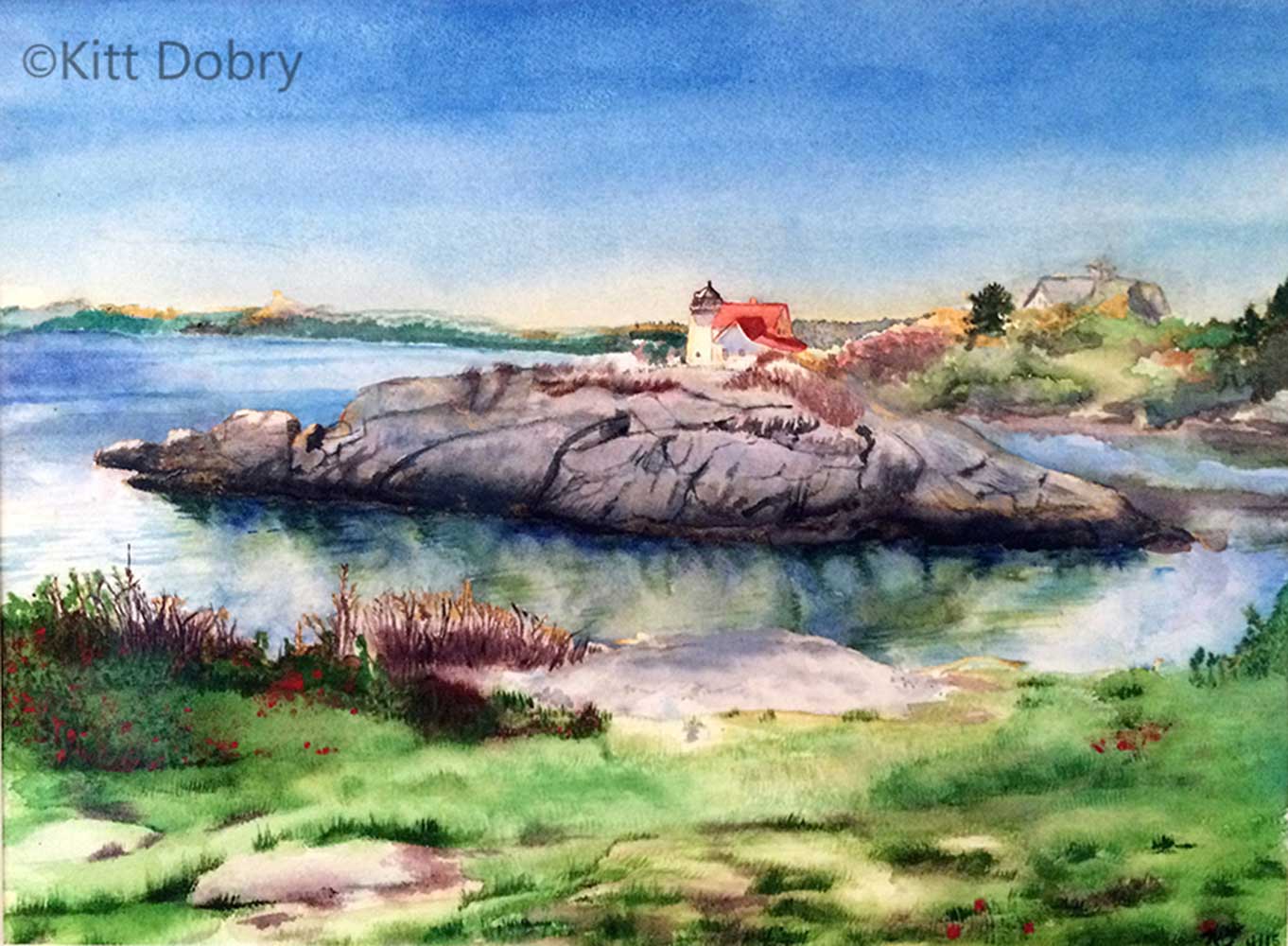 Watercolor painting of an island off of the coast of Maine, lighthouse visible on the island. The water shows reflections from the sky above, and the foreground shows the flora of the coast.